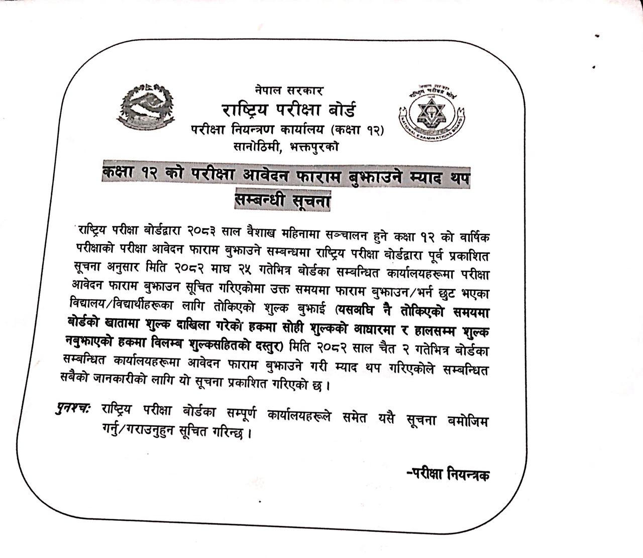 कक्षा १२ को परीक्षा आवेदन फारम बुझाउने म्याद थप सम्बन्धी सूचना
