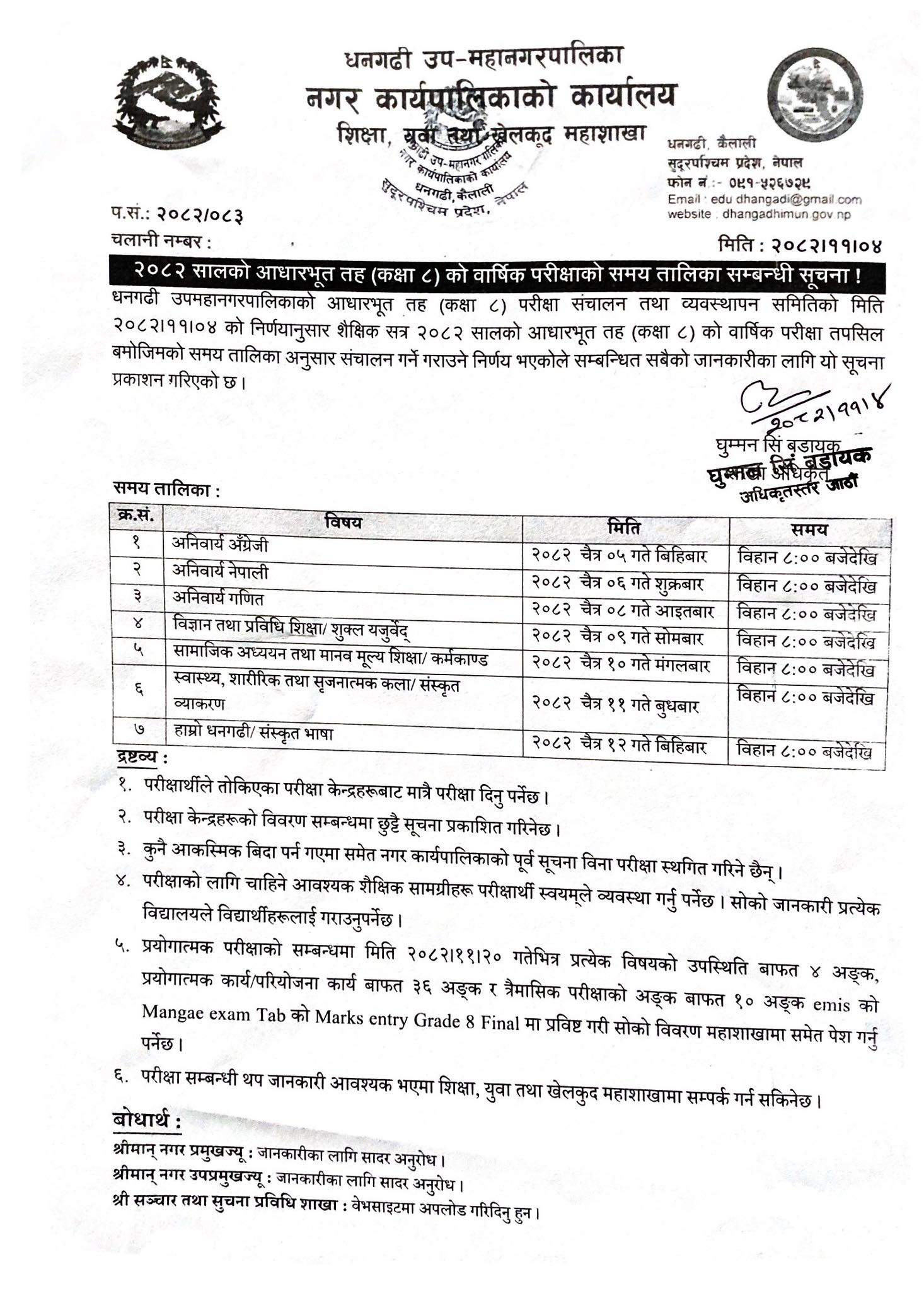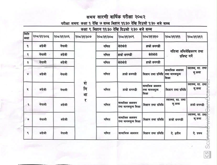 समय सारणी वार्षिक परीक्षा २०८२ को कक्षा १ देखि कक्षा ७ सम्म परीक्षा हुने समय तालिका