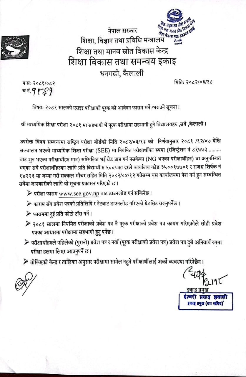 २०८१ सालको एस.ई.ई. परिक्षाको पुरक को आबेदन फराम भर्ने/भराउने सूचना