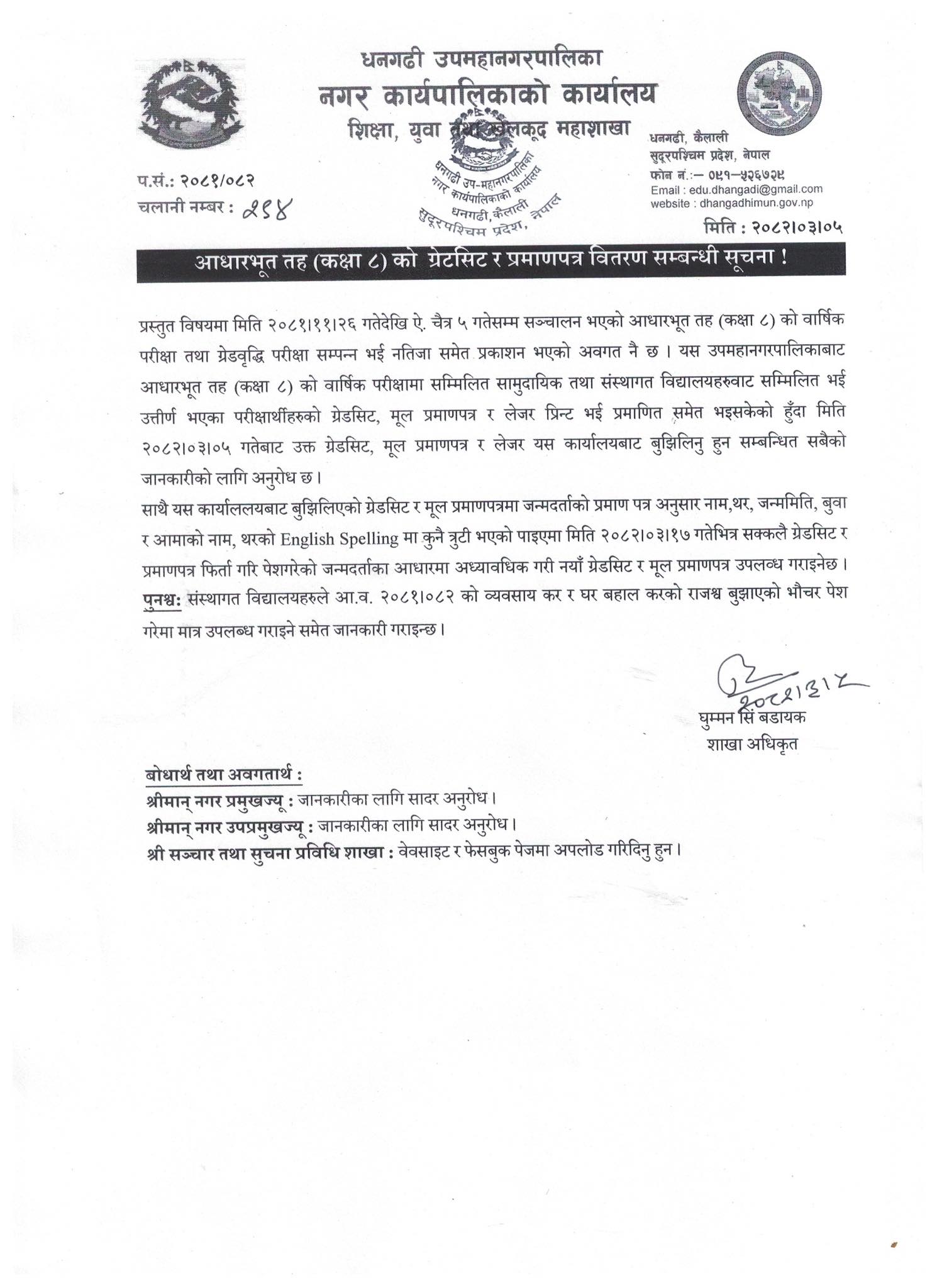 आधारभुत तह कक्षा ८ को ग्रेडसिट र प्रमाण पत्र सम्बन्धि सुचना