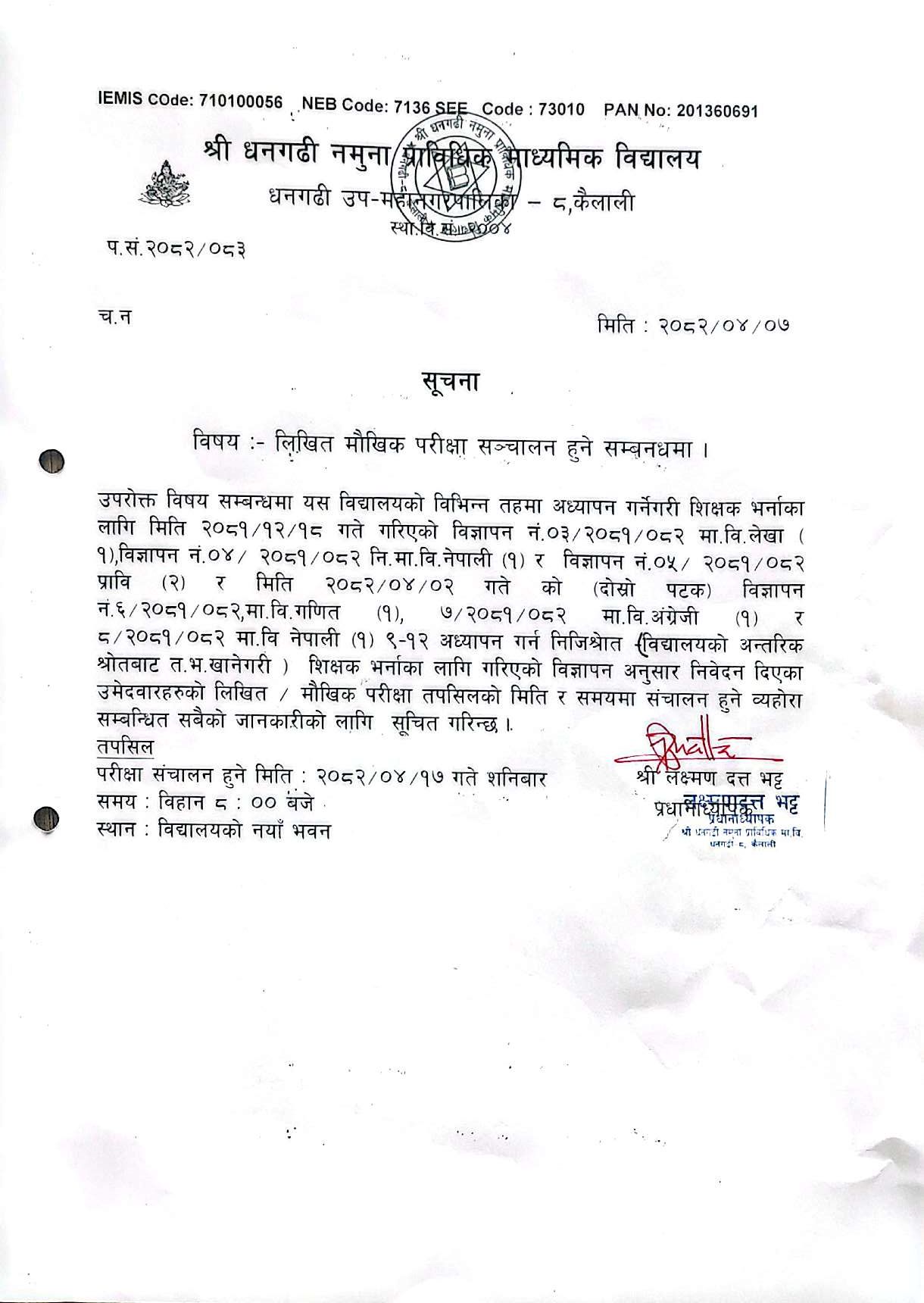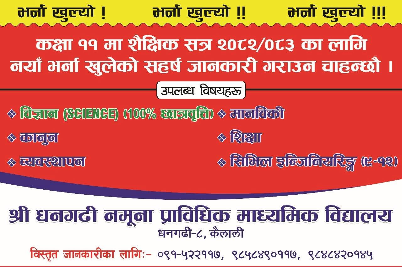 श्री धनगढी नमुना प्राबिधिक मा. बि. मा दोश्रो पटक शिक्षक आवश्कता सम्बन्धि सुचना २०८१/०८२