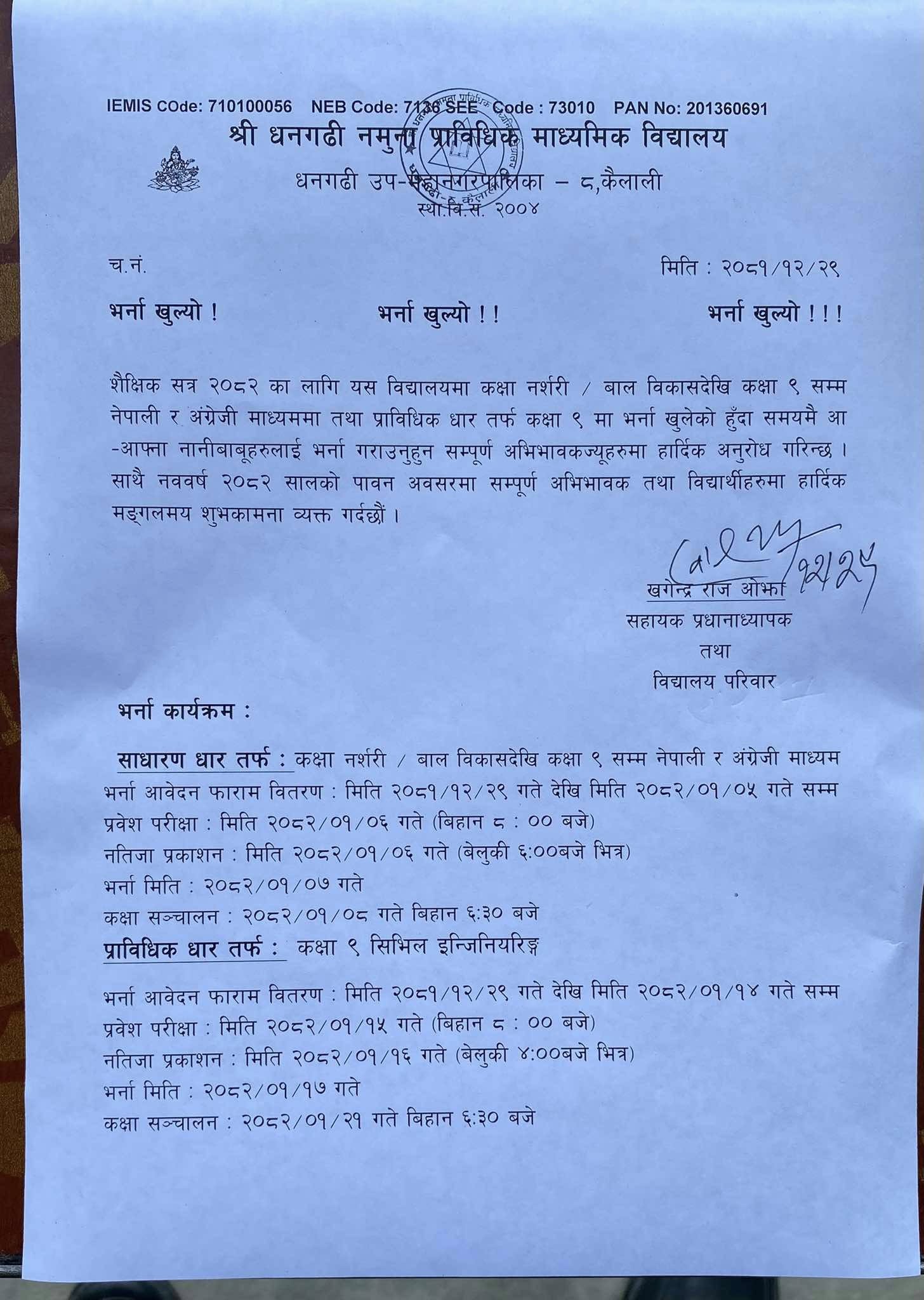 कक्षा ९ को रजिष्ट्रेशन २०८२ कोफारम भर्ने सम्वन्धमा
