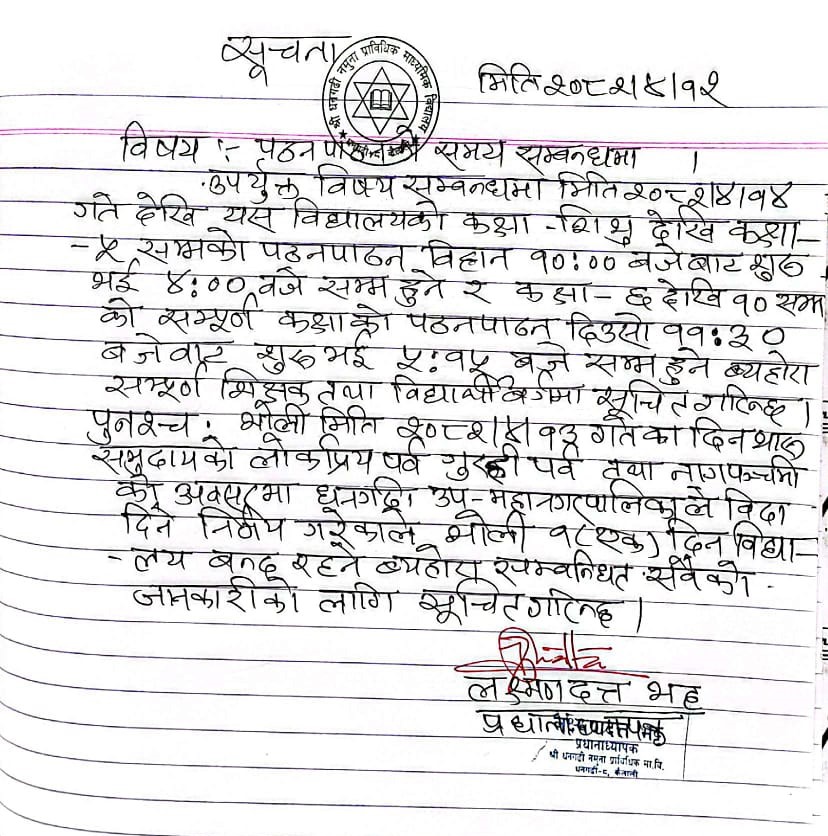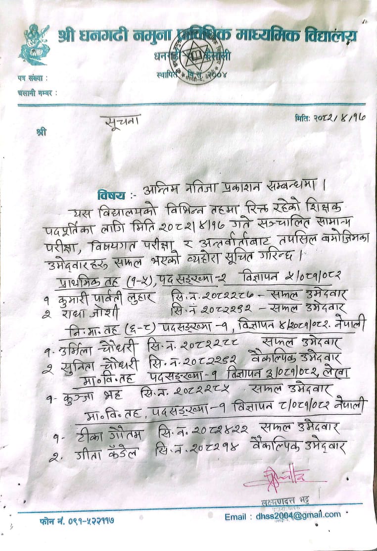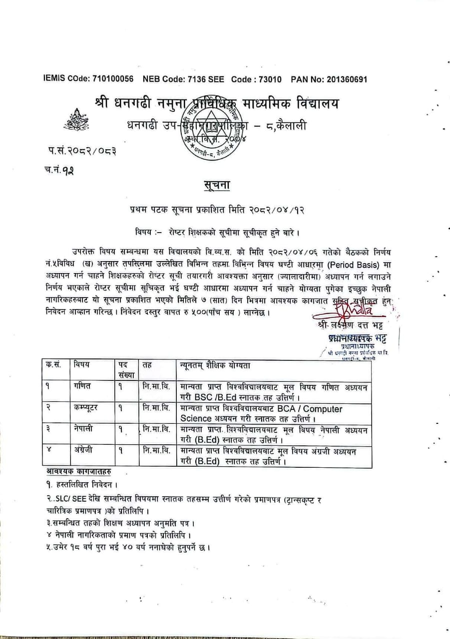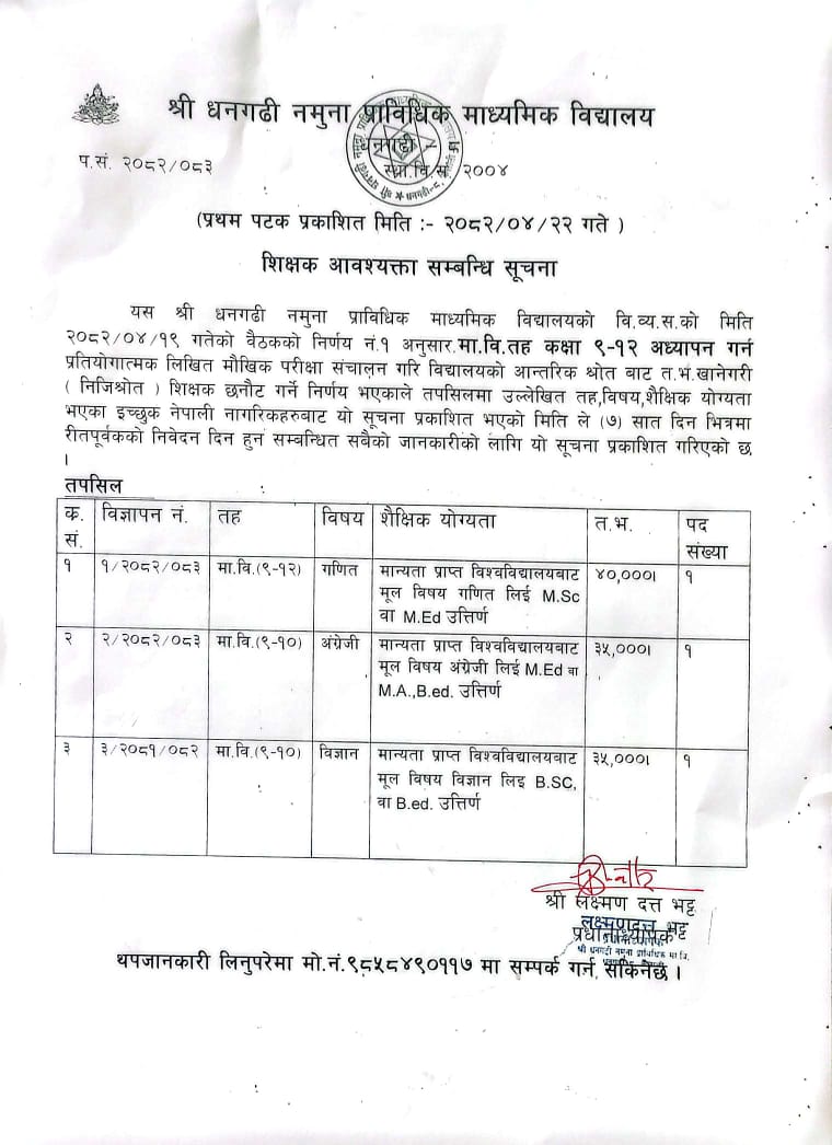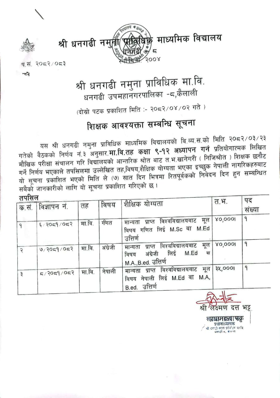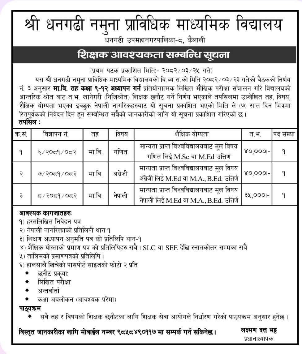 श्री धनगढी नमुना प्राबिधिक माध्यमिक बिद्यालय मा शिक्षक आवश्कता सम्बन्धि सुचना २०८१/०८२