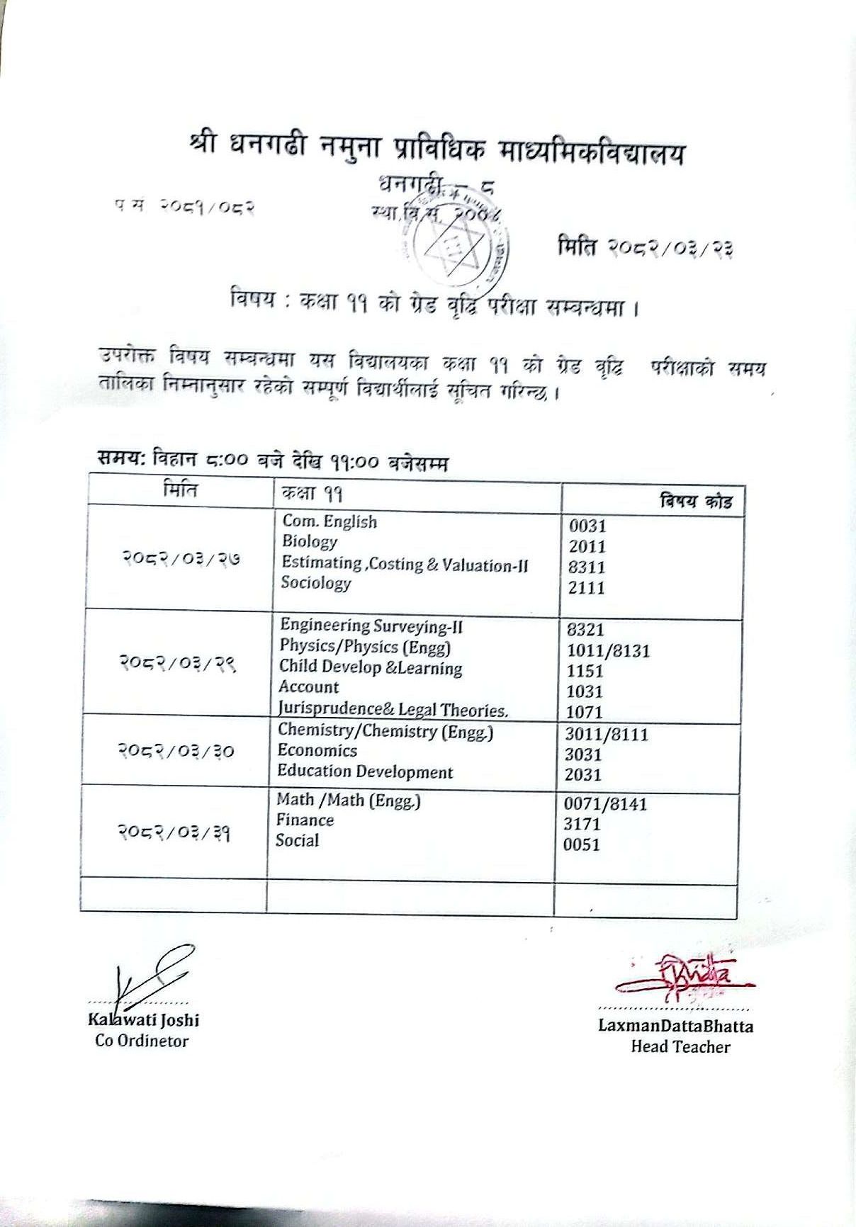 कक्षा ११ को ग्रेड वृद्धि परिक्षाको समय तालिका
