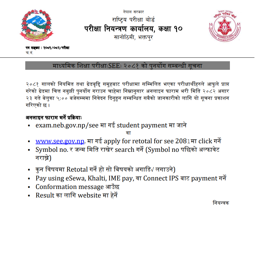 माध्यममक मिक्षा परीक्षा SEE २०८१ को पुनयोग सम्बन्धी सूचना