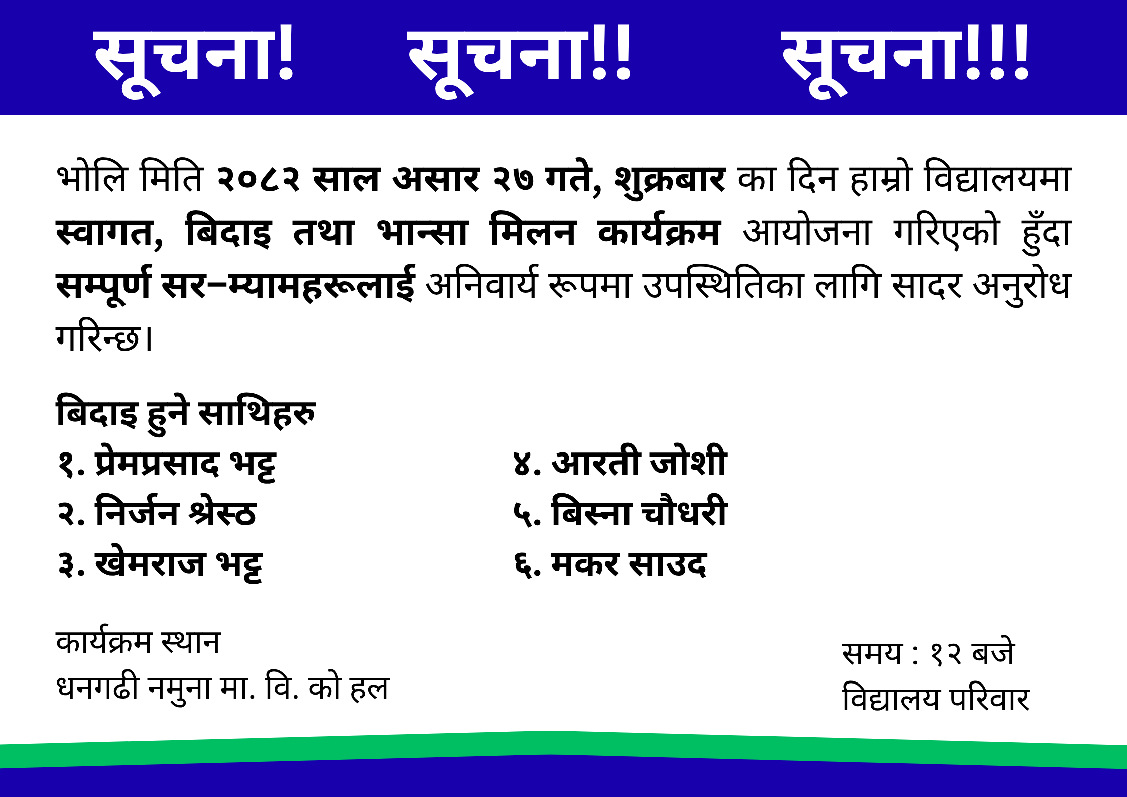स्वागत, बिदाइ तथा भान्सा मिलन कार्यक्रम आयोजना गरिएको हुँदा सम्पूर्ण सर–म्यामहरूलाई अनिवार्य रूपमा उपस्थितिका लागि सादर अनुरोध गरिन्छ।